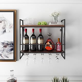 BENOSS 23.6 インダストリアル 壁掛け ワインラック 5本のステムグラスホルダー付き 金属製ハンギングワインホルダー 2段 金属製ハンギングワインラック 木製シェルフフローティングシェルフ